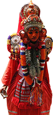 The Vedan or hunter is impersonated by a boy, in a peculiar make-up, who is armed with bow and arrows and accompanied by an attendant who carries a small drum on his shoulder. The vedan gets a ceremonial welcome in each household. In the course of the welcoming ceremony, the drummer chants a folk song which has for its theme, the precarious life of a hunter in the forest, his attempts to make a living by taking to agriculture, the difficulties of cultivation in the hilly tracts and the wild nature of the country, teeming with animals. He describes particularly the story of the pursuit of a wild boar by the hunter and his triumphant encounter with Arjuna.